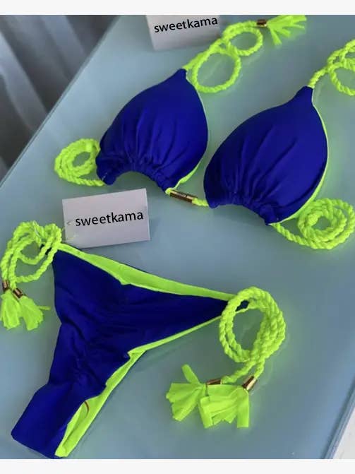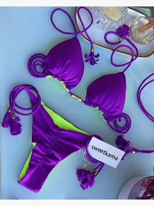 Features: * Ladies Bikini Set * Polyester and Spandex * Color Block * Classic Style * Fabric with Stretch * String Tie Shoulder * Triangle Cup * String Tie Bottom * Vivid Color *
